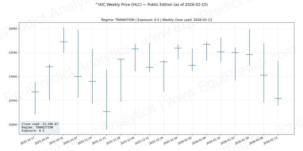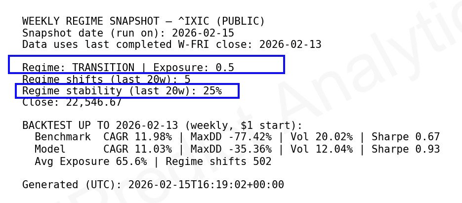 Regime classifications (Risk-On, Transition, Risk-Off) reflect general exposure posture rather than short-term market timing.