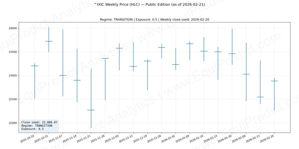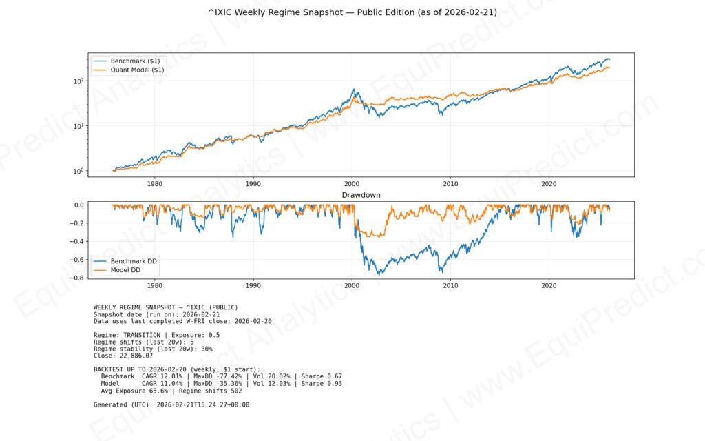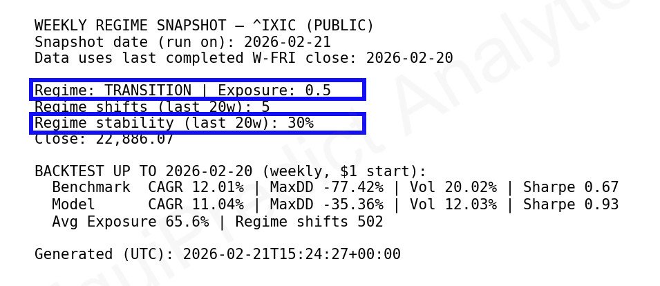 Regime classifications (Risk-On, Transition, Risk-Off) reflect general exposure posture rather than short-term market timing.