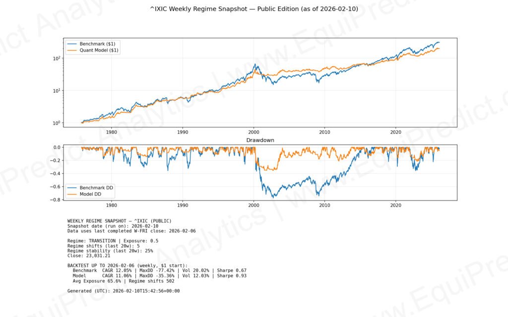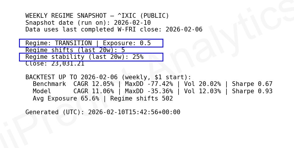 Regime classifications (Risk-On, Transition, Risk-Off) reflect general exposure posture rather than short-term market timing.