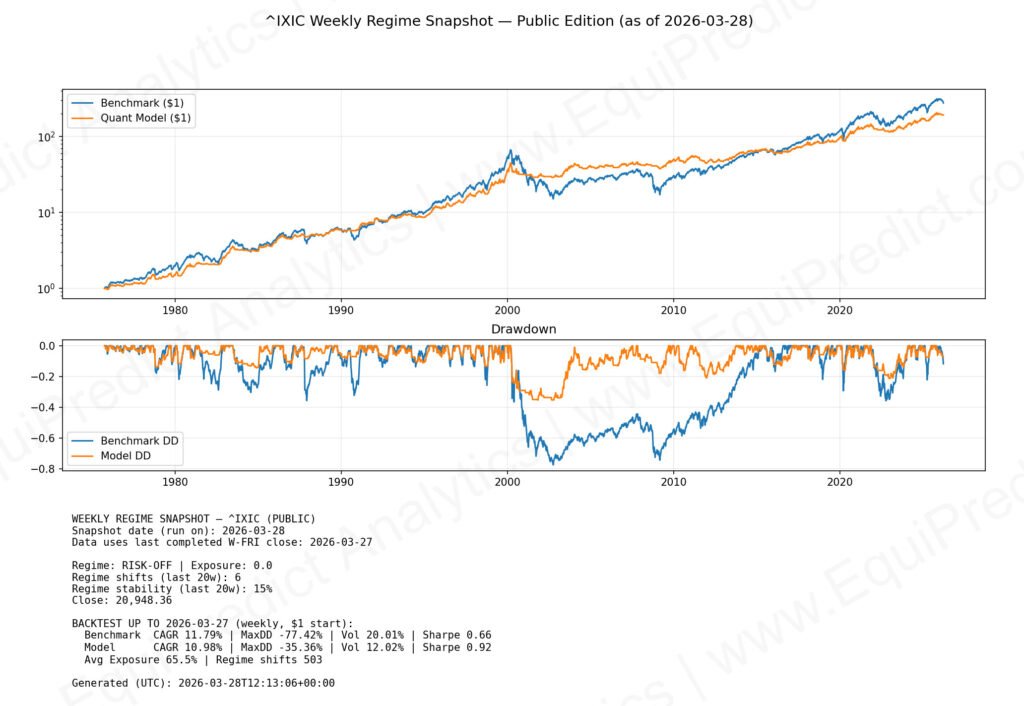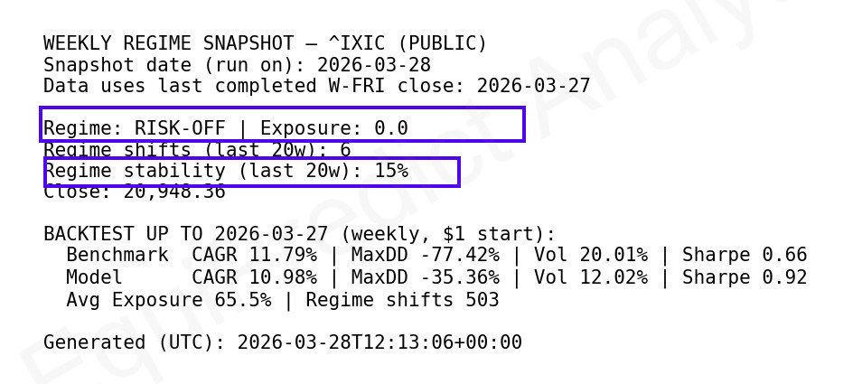 Regime classifications (Risk-On, Transition, Risk-Off) reflect general exposure posture rather than short-term market timing.