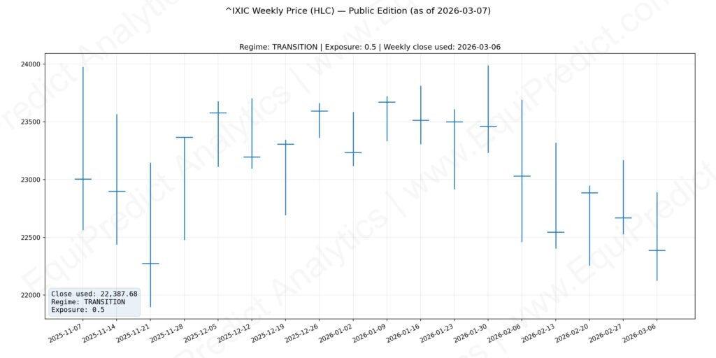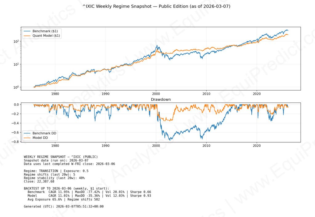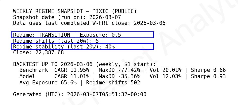 Regime classifications (Risk-On, Transition, Risk-Off) reflect general exposure posture rather than short-term market timing.
