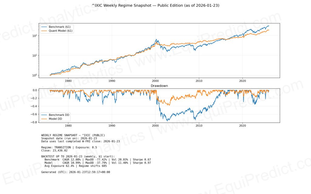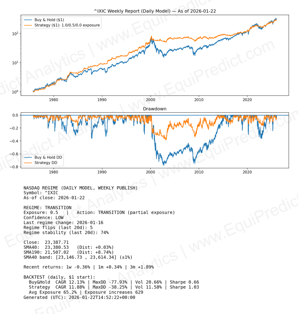 For those interested in broader market regime context, this weekly snapshot shows an objective daily trend model applied to the Nasdaq using long-term historical data.