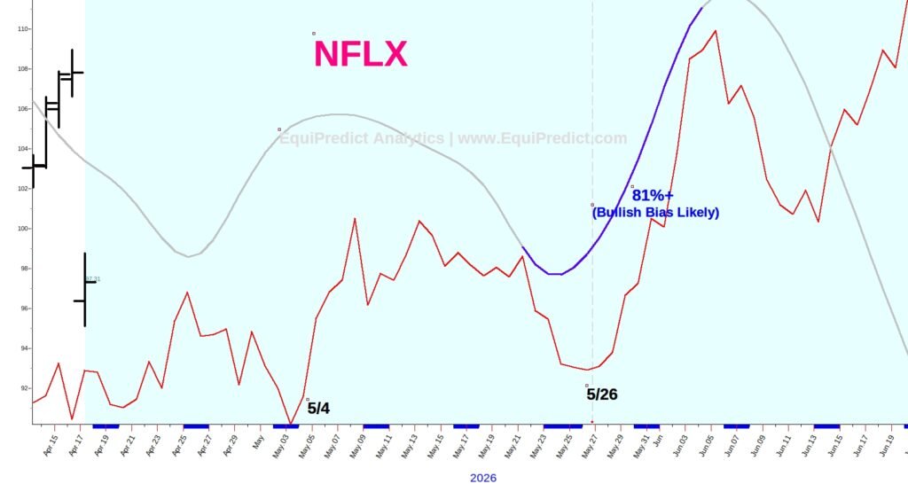 For those looking for a next entry into NFLX, two dates have been marked off on the chart to look for a change in trend. A Blue Wave forecast has also been overlaid on the chart with an 81% probability attached. Blue Wave forecasts add supporting evidence to likely bullish bias (or bearish bias if indicated) over a given period on the calendar. Note: the greyed-out portions of the forecast line should be largely disregarded.