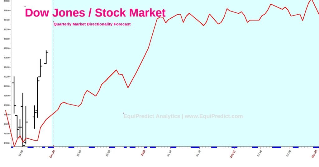 The original forecast and results are copied below. Per the 12/1/25 forecast, the Dow continued its rally into early January, but consolidated sideways from there on.