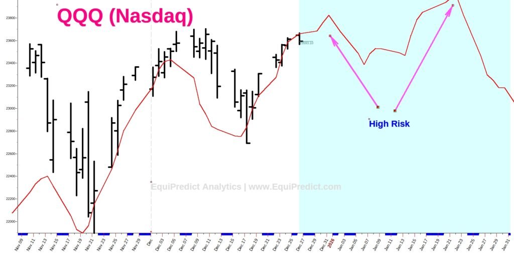 Recent price behavior in QQQ (represented here by the Nasdaq Index) suggests the market is entering a more fragile short-term phase, where upside momentum is becoming increasingly difficult to sustain.