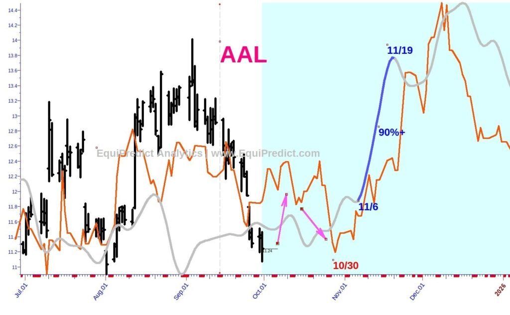 The forecast here for American Airlines (Ticker: AAL) points to a bounce occuring shortly, followed by another more sustained bullish bias period starting the last week of October into December.