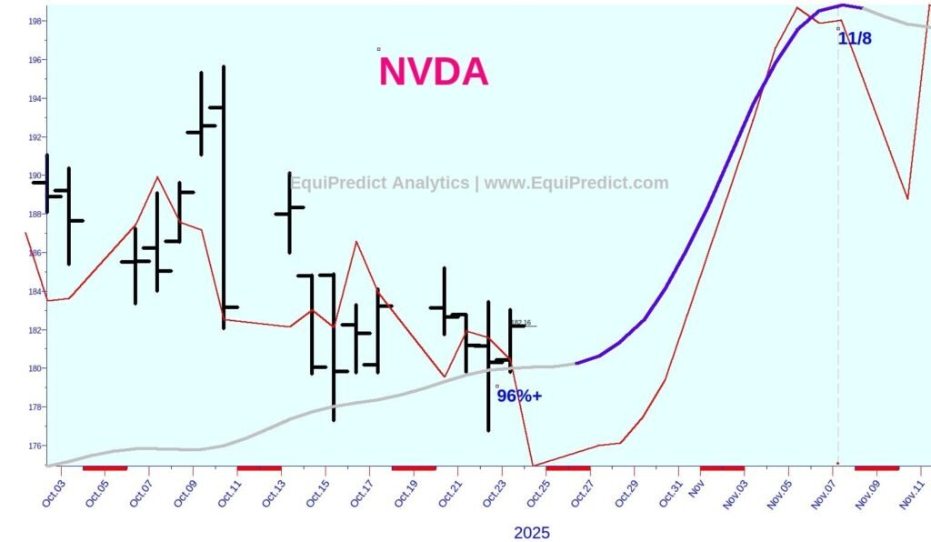 An Nvidia stock (Ticker: NVDA) Blue Wave with a 96% probability begins on Sunday 11/26 and terminates on 11/8. The Blue Wave agrees with a previously published historical volatility forecast, shown in red.