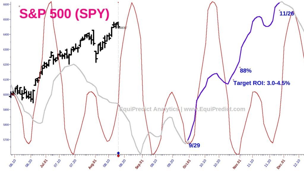 The chart below is a daily chart of the S&P 500. There is an operative Red Wave cycle present, and an 88% Blue Wave forecast has been overlaid with a target ROI of 3-4.5% between the dates shown.