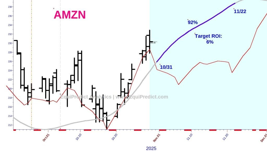 Although AMZN may also correct in price after earnings, both are pointing to strength starting Friday of this week, 10/31, until late November.