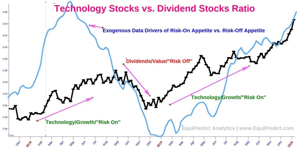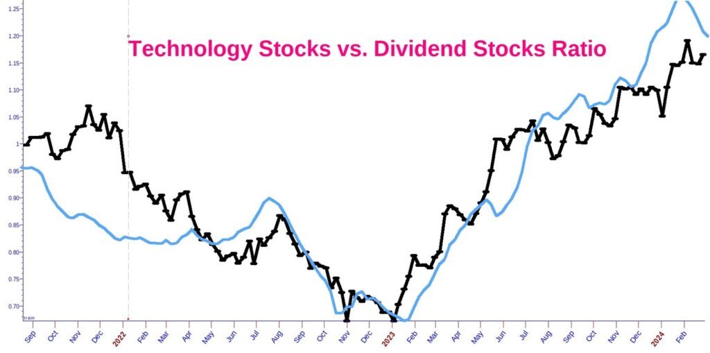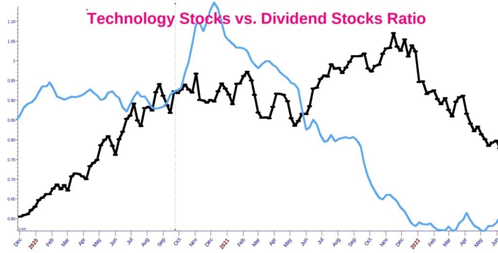 The charts below span from 2018 to the present. The black line represents a ratio of technology stock performance vs. dividend stock performance. When the black line rises, it indicates that Wall Street is favoring tech stocks — a risk-on signal. When the line declines, it signals a rotation into dividend-paying stocks — a risk-off environment.