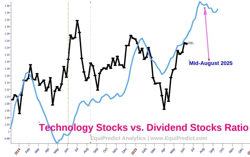 Despite the “doom and gloom” sentiment echoed across mainstream financial media, this model points to continued bullish momentum into August 2025. Based on this data, dividend stocks are unlikely to gain favor until mid-to-late August.