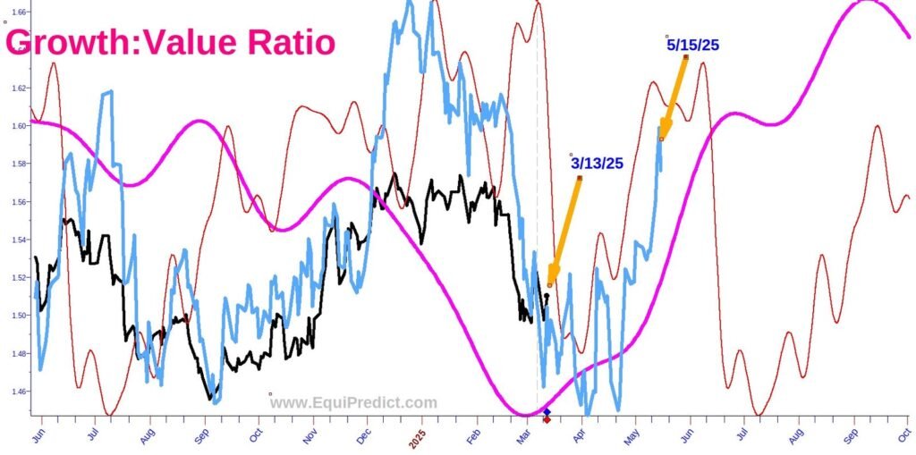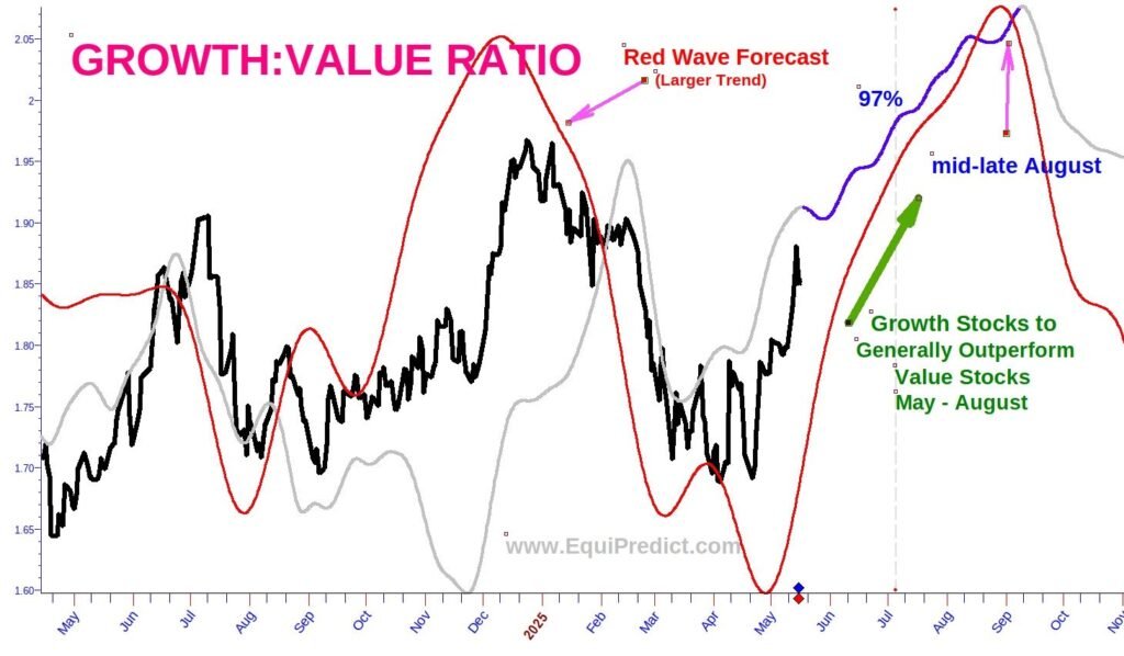 Edit: 5/17/25 – Blue Wave forecast uncovered for growth stocks outperforming value stocks between now and late August. New chart agrees with other forecasts. Chart has been added to bottom of post.