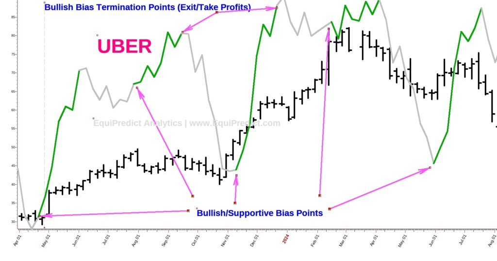 The charts below focus on Uber Technologies (Ticker: UBER) and illustrate how EquiPredict’s Red Wave and Green Wave models are used to assess market risk and directional bias.